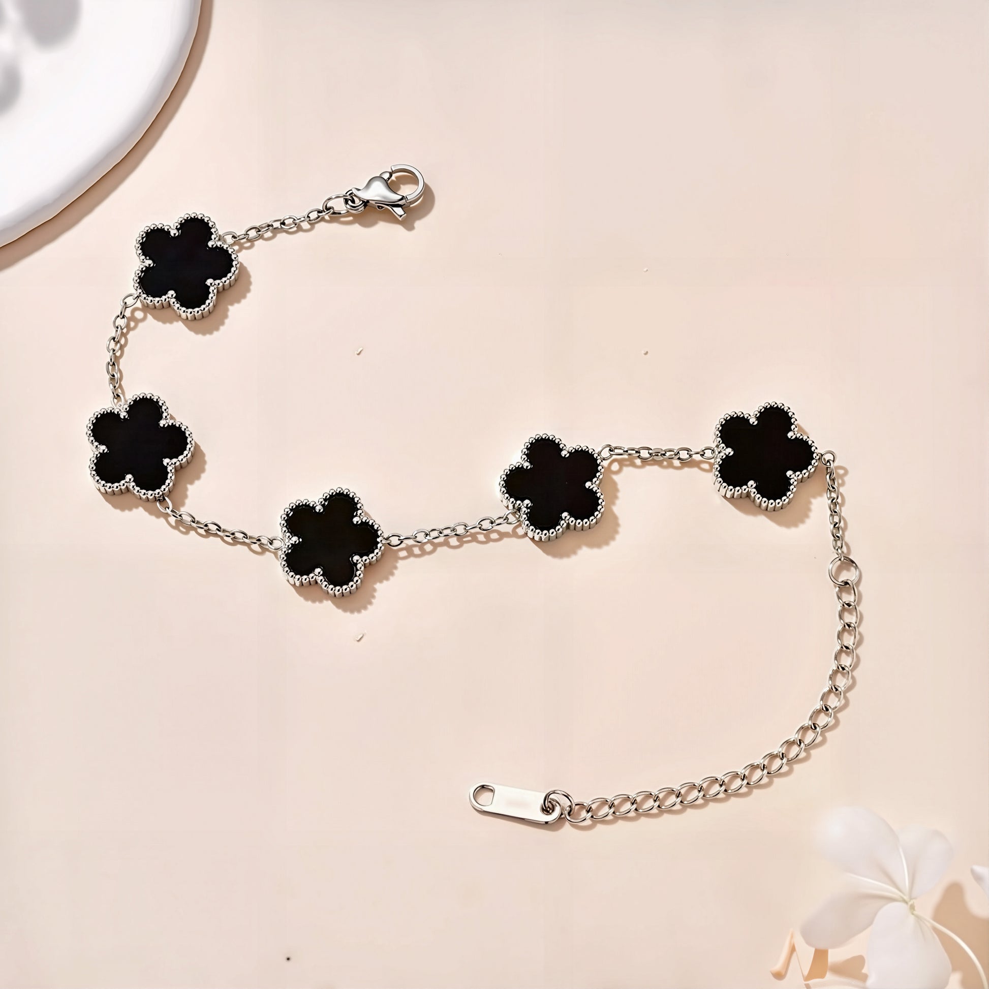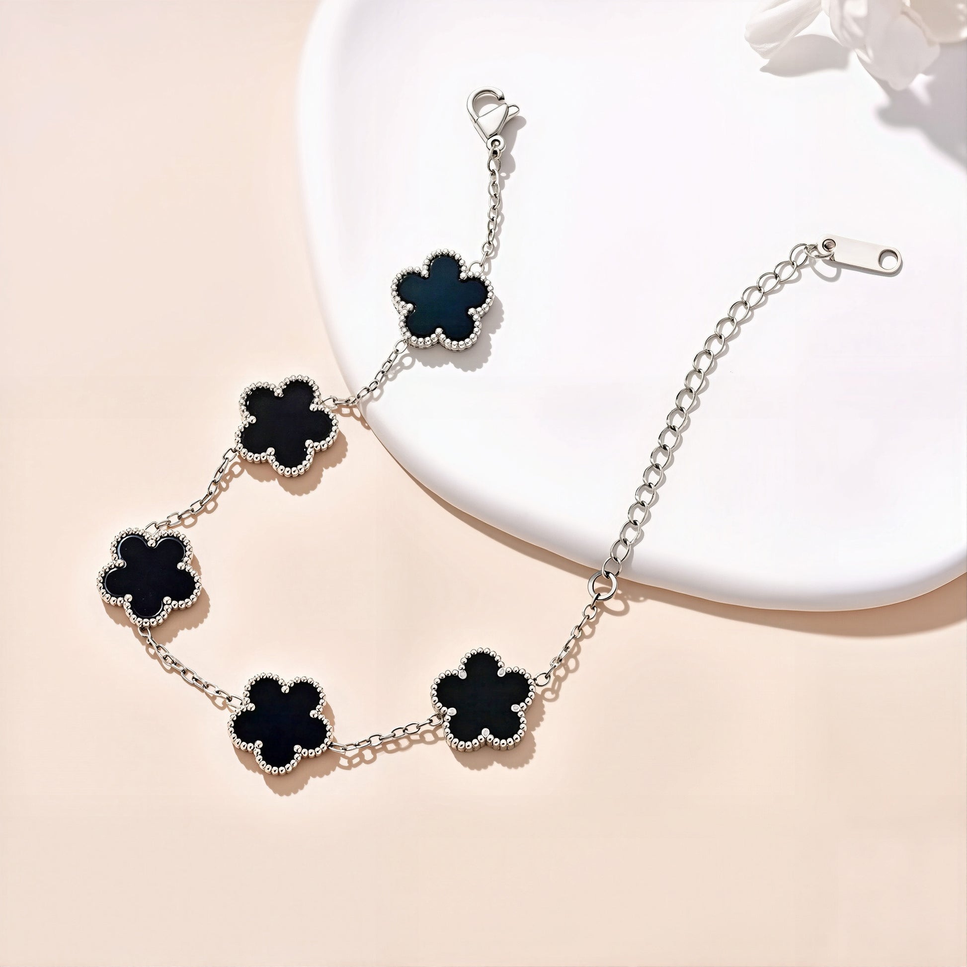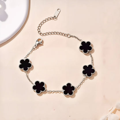 The Fortune Five Clover Bracelet from the Monochrome Edition offers timeless elegance with five iconic quatrefoil charms in black, white, or a mix of both. Choose from the shimmering Mother of Pearl or sleek Onyx finishes, set in gold or silver. This versatile bracelet adds a sophisticated touch to any outfit, making it a lasting staple for both professional and casual occasions.