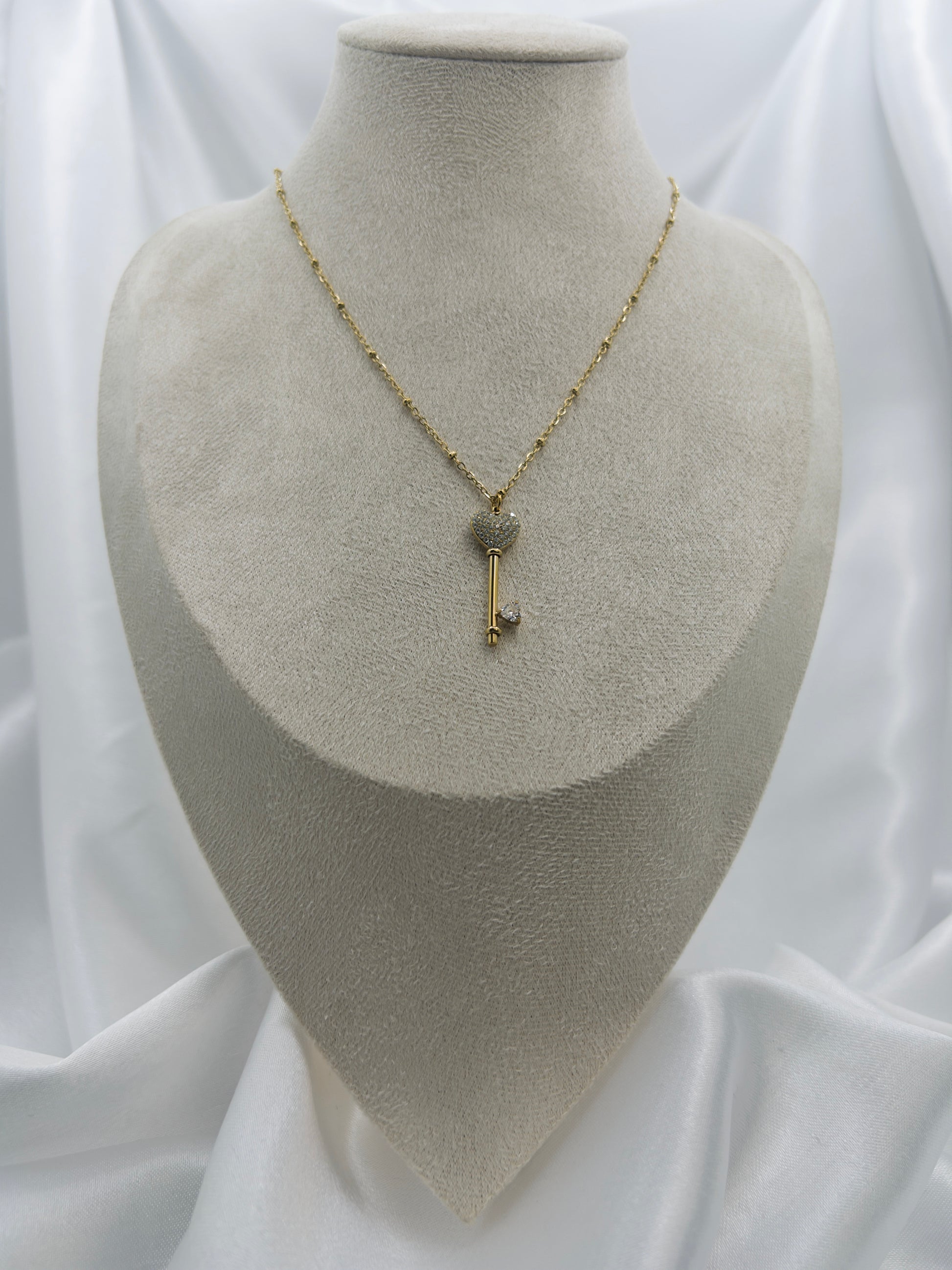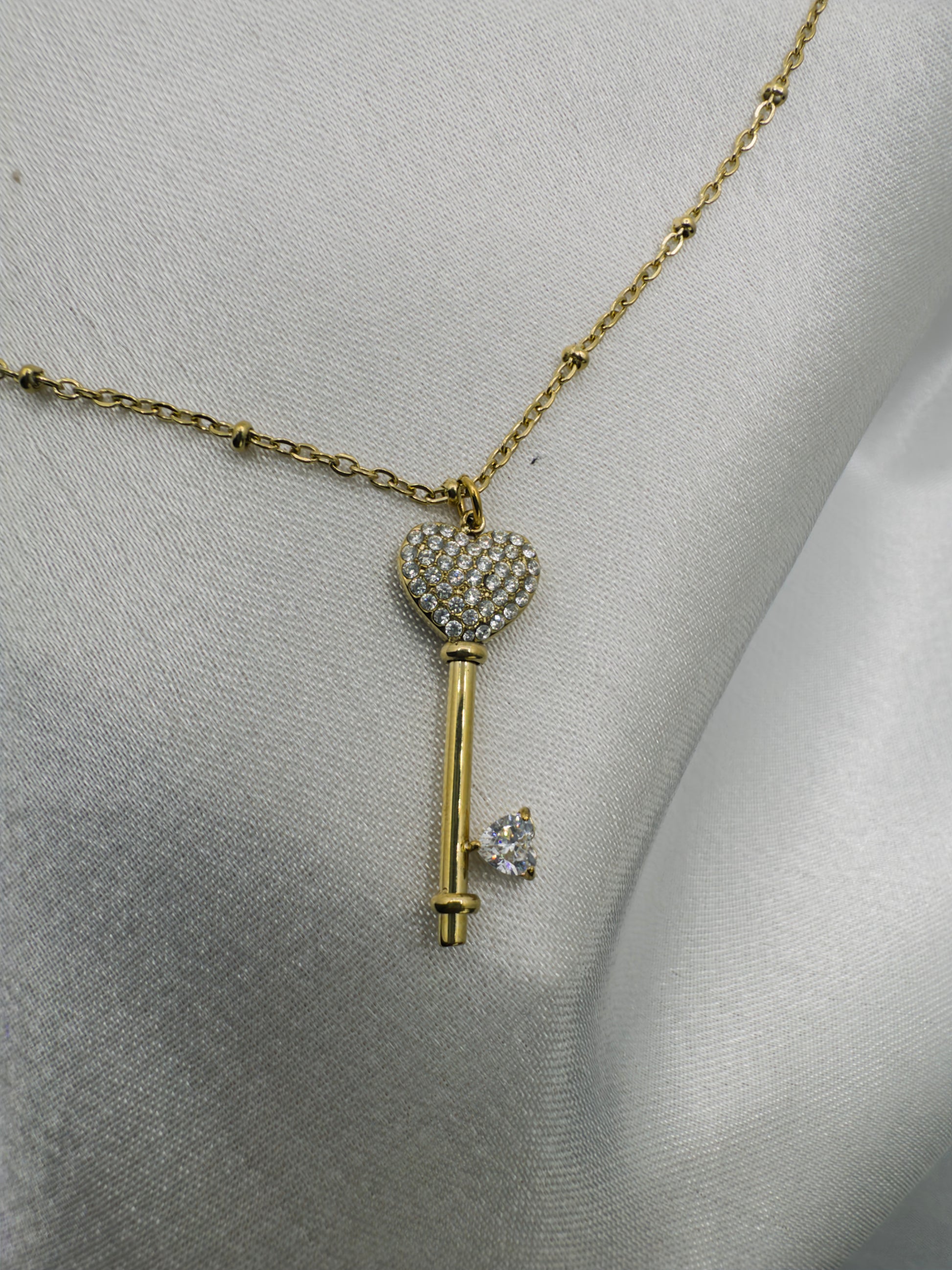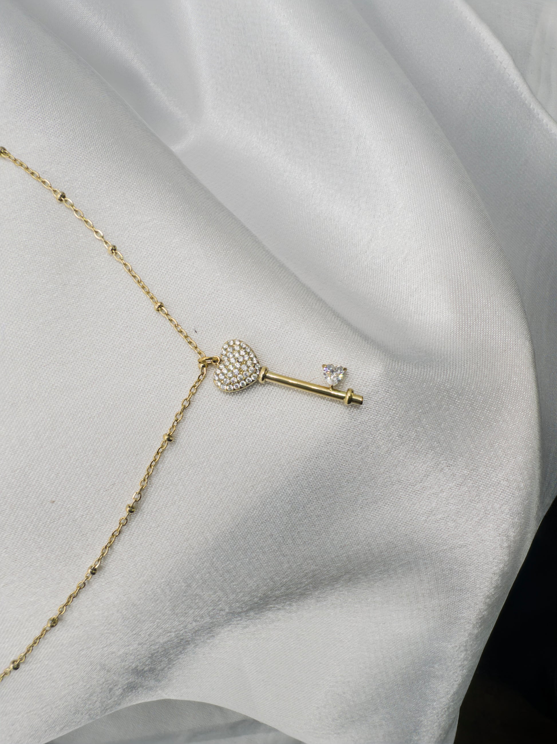 Unlock a story of timeless romance with our "Love's Key" Necklace. This exquisitely detailed piece is the ultimate symbol of trust and affection, representing the classic sentiment of holding the "key to one's heart." The head of the key is a heart, fully encrusted with sparkling pavé crystals, while a single, brilliant heart-shaped stone dangles gracefully from its tip.
