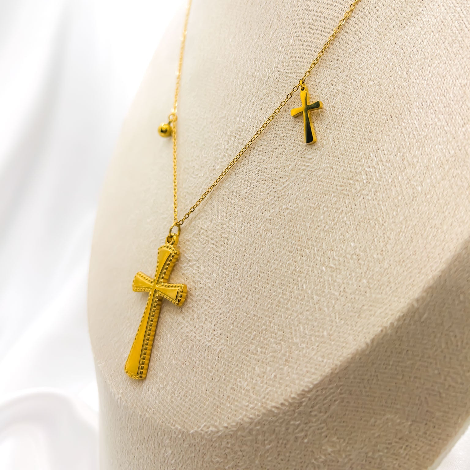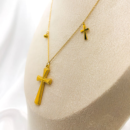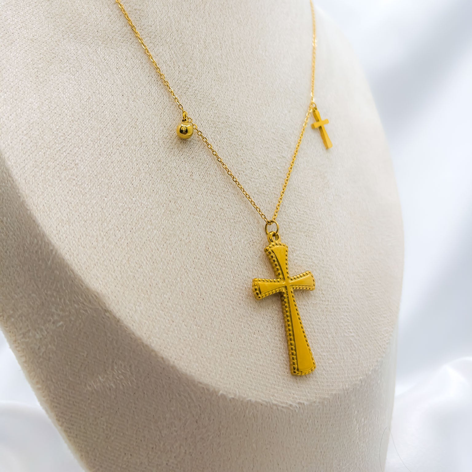 A modern expression of timeless faith, The Tamuz Necklace offers a unique, layered look in one elegant piece. The ornate, beautifully textured cross pendant makes a graceful statement, with delicate charms. A minimalist cross and a polished bead are scattered asymmetrically along the chain for a contemporary touch.